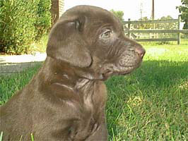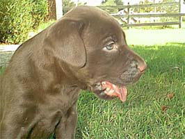 I got a side shot of this little guys head. Of all the pups here, he's the best shot at a nice blocky head. He looks a lot like his grandsire, Bud. Easy going, curious puppy. People dog, constantly underfoot. 5.75 lbs 6 weeks old. |